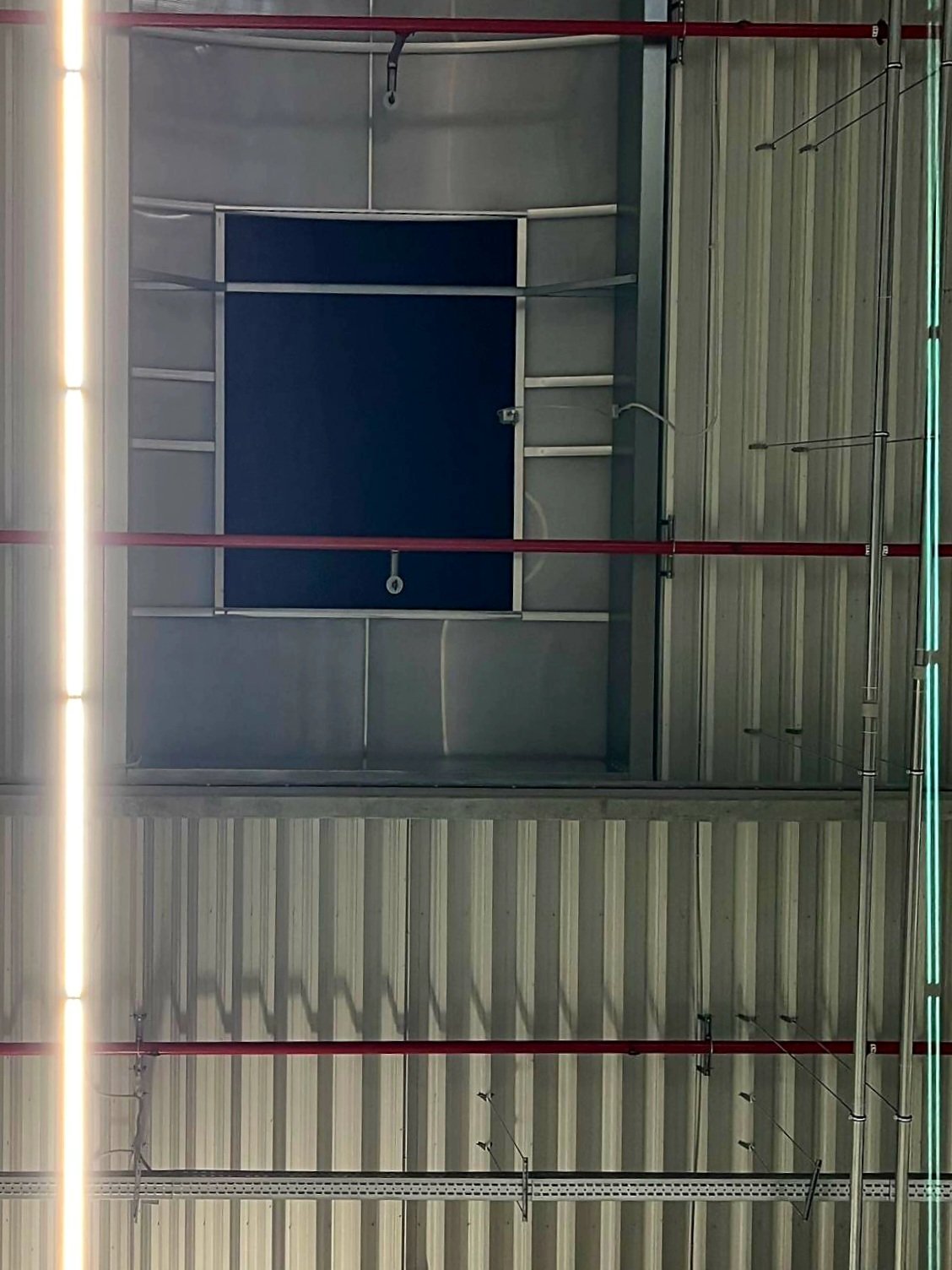 Vylomené okno svetlíka – pohľad z haly. Otvorený svetlík s poškodeným mechanizmom, cez ktorý je vidieť von.